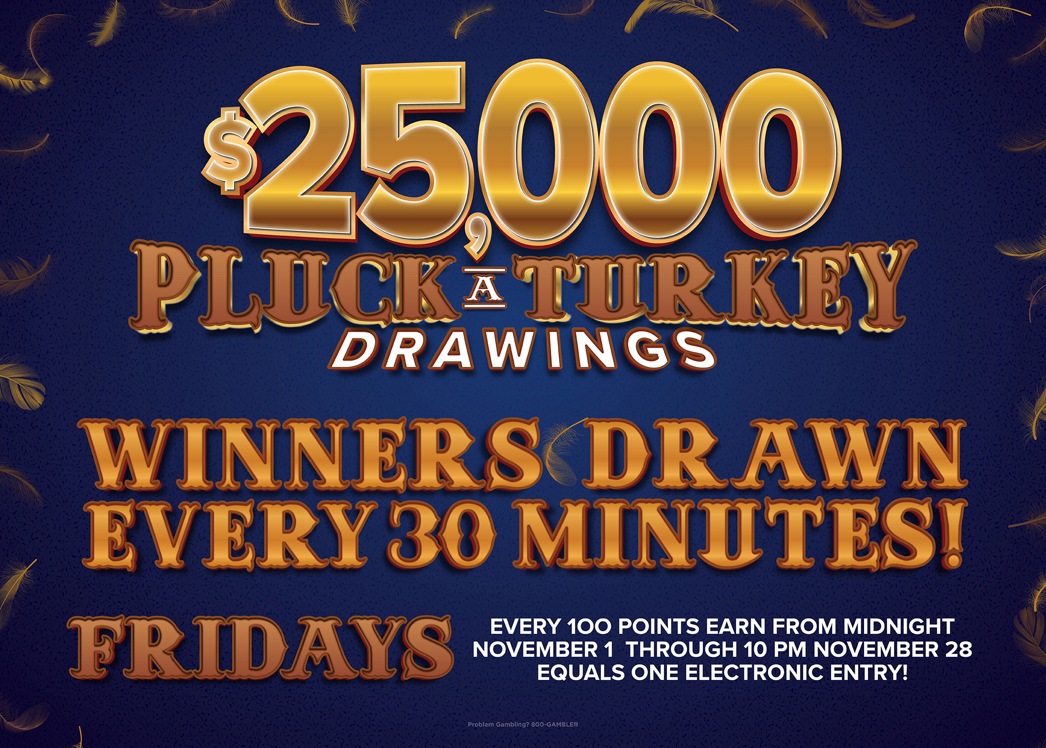 Starting midnight November 1 through 10 p.m. November 28, every 100 points earned gains one electronic entry into our $25,000 Pluck-a-Turkey Drawings! Every Friday from 6 p.m. to 10 p.m., winners will be called every 30 minutes to win cash and free slot play! Win up to two times per drawing night!