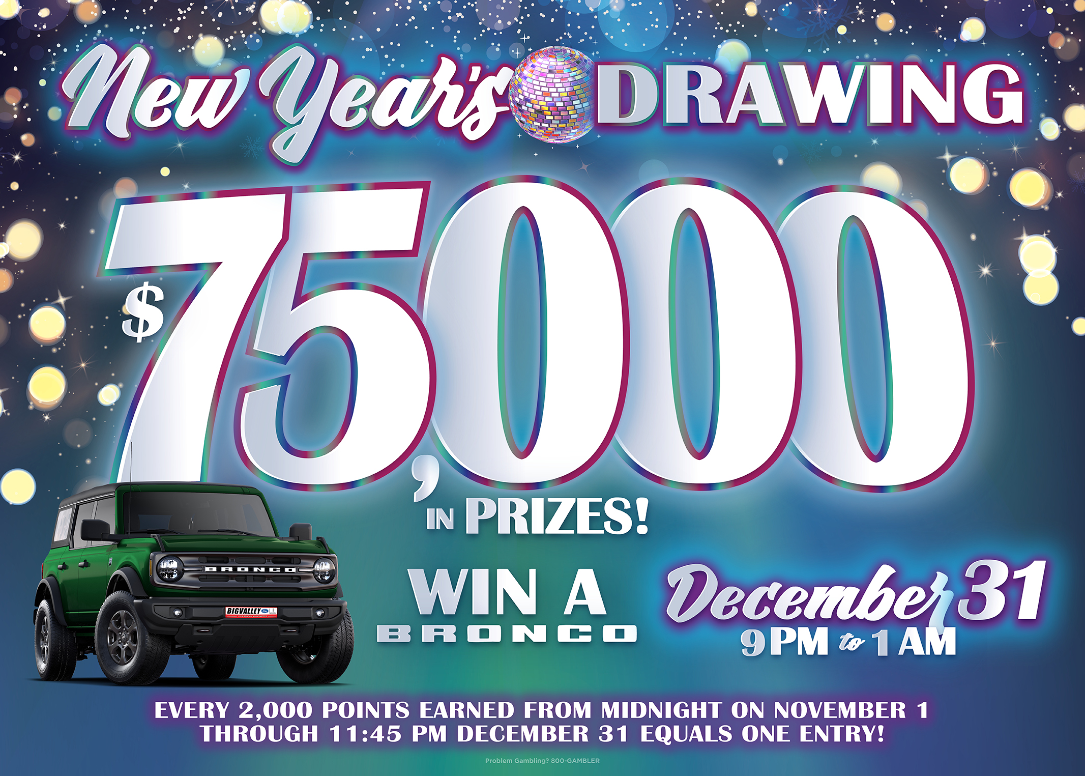 Every 2,000 points earned from midnight on November 1 through 11:45 p.m. December 31 will earn one physical ticket entry into our $75,000 New Year’s Eve Drawing! There are no limits on how many entries you can earn! Winners are drawn every 30 minutes, with one lucky player winning a BRAND NEW FORD BRONCO at midnight!