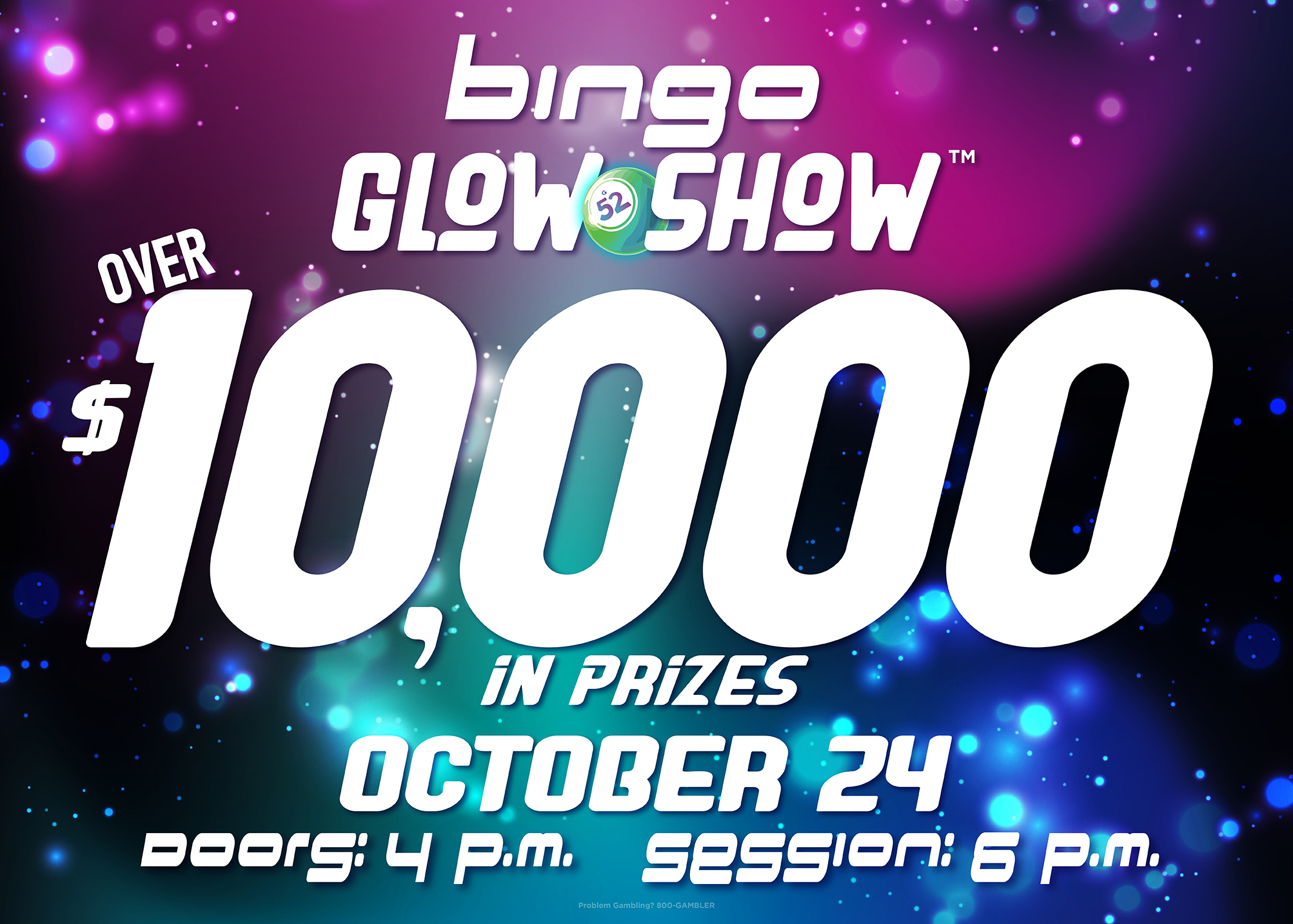 Join us for Bingo Glow Show event on Friday, October 24! Doors open at 4 p.m., and the session begins at 6 p.m. We will have specialty Glow Packs for purchase and over $10,000 in prizes! 18 and older are welcome! Dress for black-light fun and get ready to BINGO!
