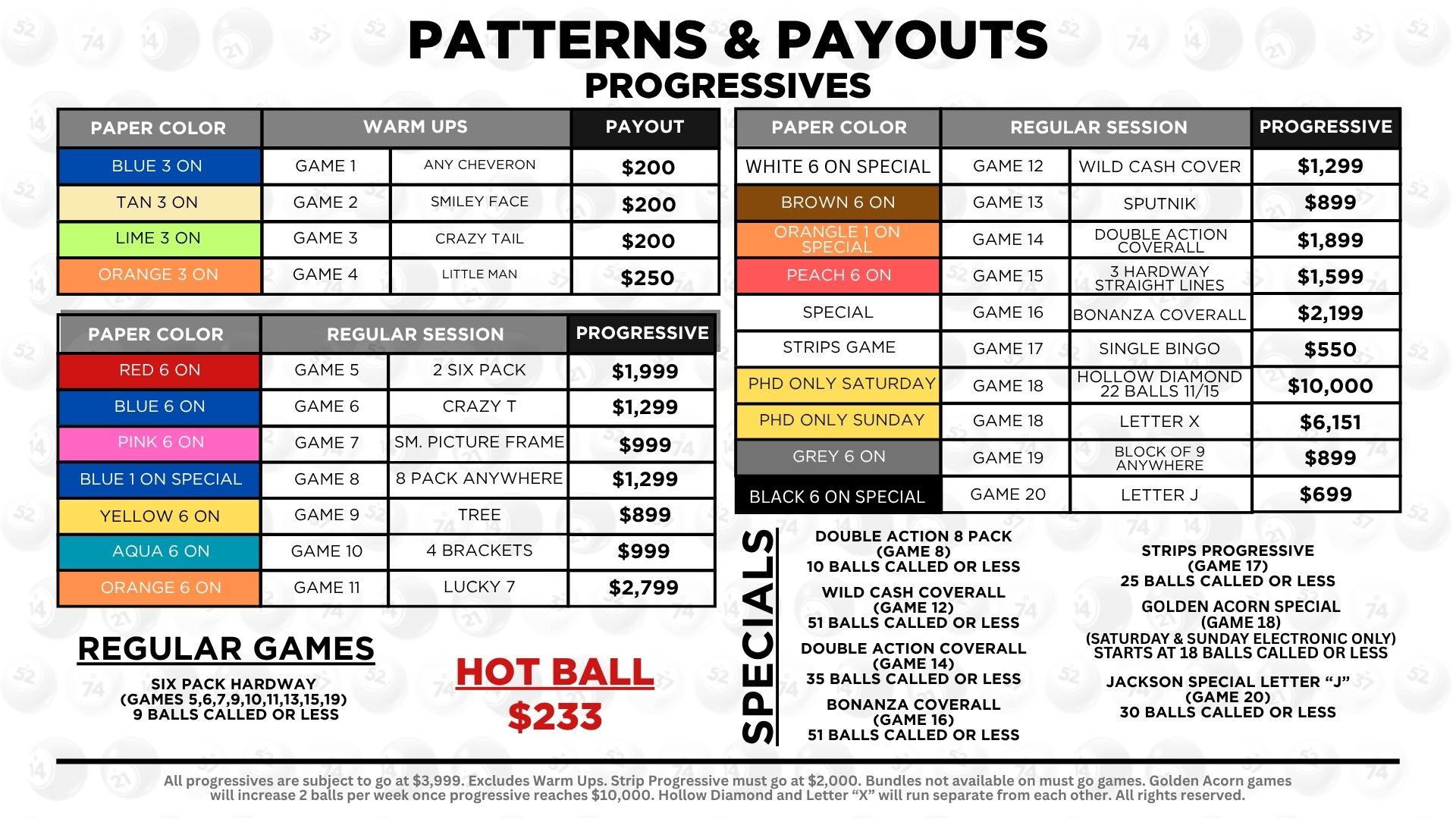 BINGO PAYOUTS & PATTERNS PROGRESSIVE PAYOUTS