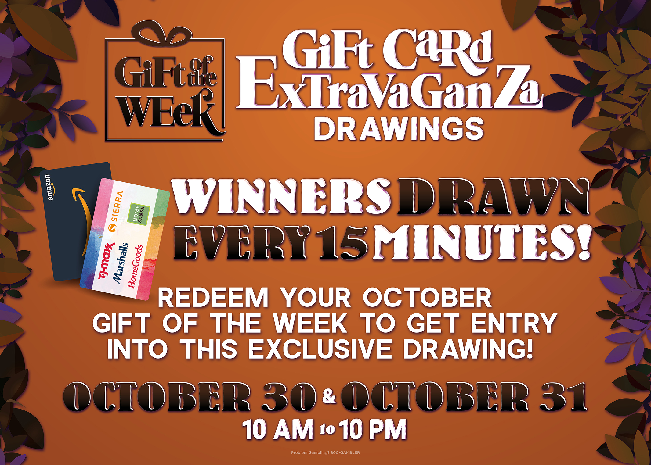 On Thursday, October 30, and Friday, October 31, we will host a drawing every 15 minutes for Gift Cards! The Gift of the Week Gift Card Extravaganza drawing will be from 10:00 a.m. to 10:00 p.m., with winners being drawn every 15 minutes. To qualify, guests must have redeemed at least one Gift of the Week (GOW) gift in October. Physical entry tickets will be available for printing starting at 10 a.m. each drawing day. Printing will stop at 9:59 p.m. each drawing day, and entry tickets must be in the drum by 10 p.m. for participation!