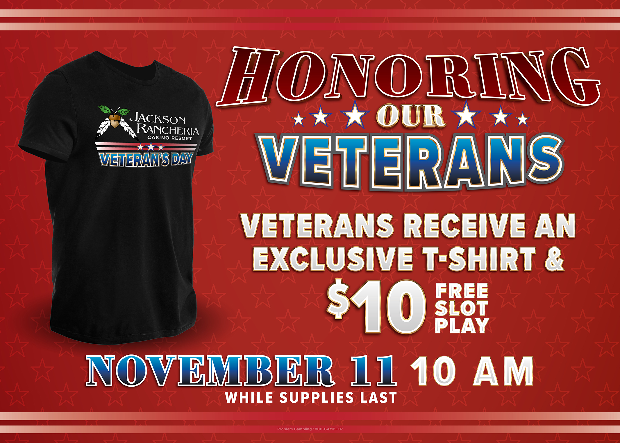 We will celebrate Veterans Day by offering all active-duty and retired military Veterans an exclusive Veterans Day tee shirt and $10 in Free Slot Play. To receive the Veteran’s Day tee shirt and Free Slot Play, guests must present a Veterans Card, Military I.D., American Legion Card, or their DD 214 (discharge papers) at the Dreamcatchers Club® during promotion hours. Eligible guests may participate only once between 10:00 a.m. and 10:00 p.m. on Tuesday, November 11. (Exclusive Veterans shirts are available while supplies last, exclusive to Veterans and active-duty military personnel; spouses are not eligible to participate.) T-shirts will be available while supplies last.