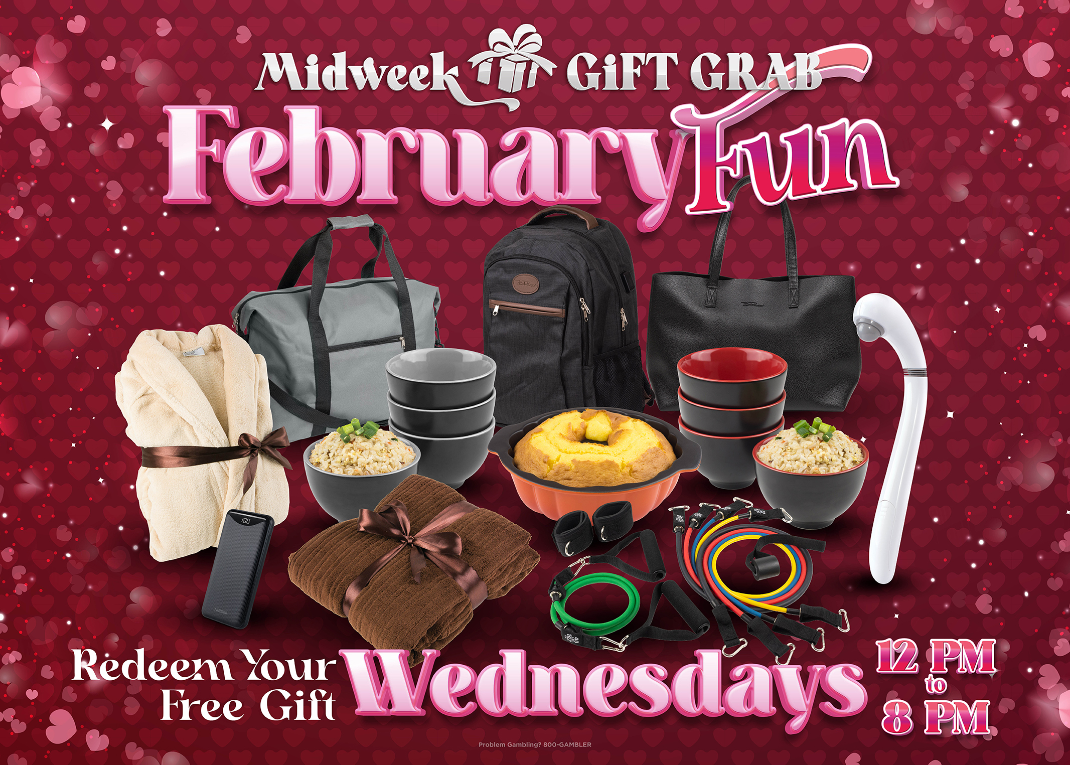 Our exclusive Midweek Gift Grab will occur on Wednesdays in February from 12:00 p.m. to 8:00 p.m. The kiosks will be active from 11:00 a.m. to 8:00 p.m. Qualified guests may print their redemption receipt as early as 11:00 a.m. Guests may only participate once per promotional week.